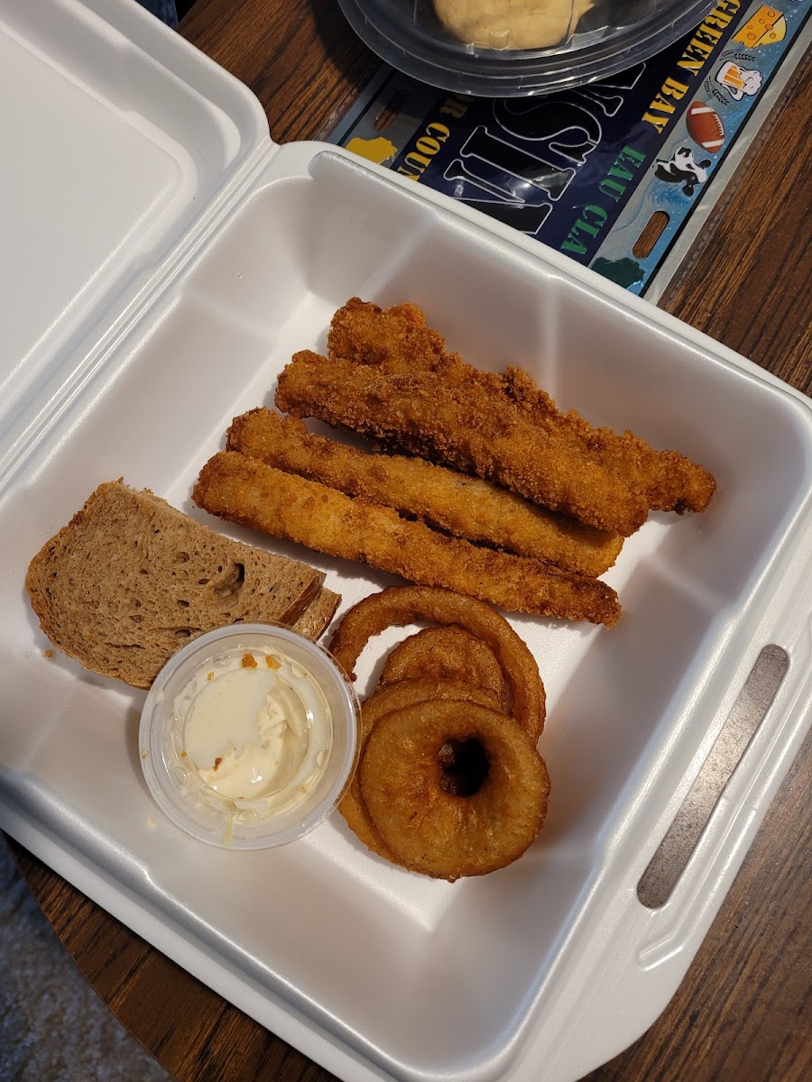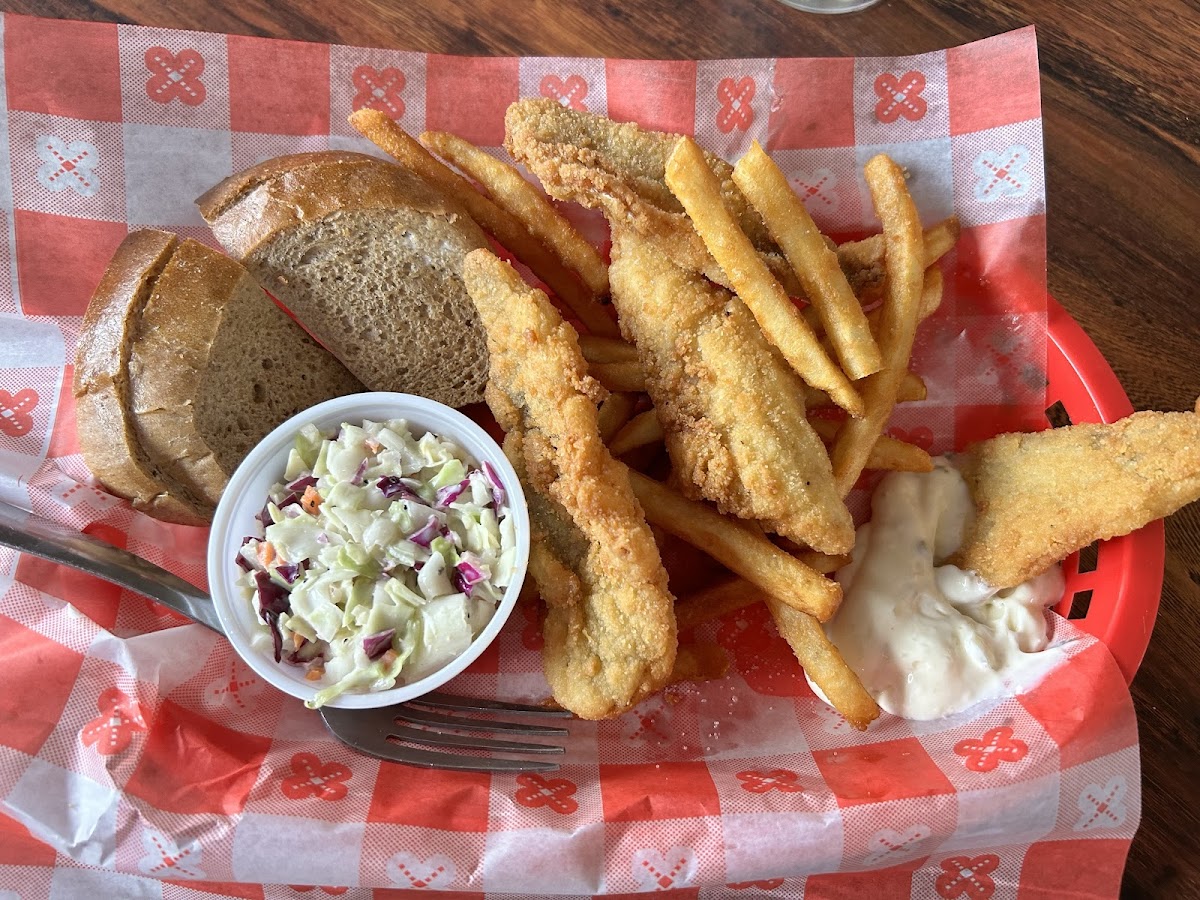 If you sit in the back area, adjacent to the bar, you’ll be waiting a little while to be waited on. Fridays are busy at the bar. I had the four piece perch platter with fries, slaw and rye bread. It was actually pretty good for the price.